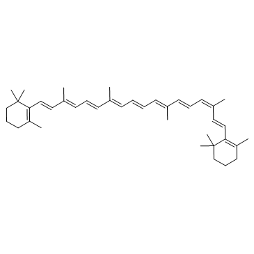 9-cis-β-Carotene, a precursor of retinal, is cleaved by beta-carotene oxygenase 1 (BCMO1) to produce 9-cis-retinal. 9-cis-β-Carotene inhibits photoreceptor degeneration and restores retinal function in vivo. 9-cis-β-Carotene has the potential for the study of congenital stationary night blindness and fundus albipunctatus[1]. In Vitro: 9-cis-β-Carotene (1 μM; 18 hours) formulates with the Miglyol 810 and the "antioxidant mix" is incubated to eye cups. The eye cups are isolated from the neuro-retina attached to the underlying RPE tissue from RPE65rd12 mouse. It prevents S- and M-cones degeneration and leads to over 2- and 9- fold higher m-opsin and s-opsin positive staining compares to the control group[1]. In Vivo: In a mouse model of retinoid cycle defect, RPE65rd12. Mice with an extract of Dunaliella Bardawil algae rich in 9-cis-β-Carotene (9CBC) rescues retinal function and preserves cone structure by oral administration[1].