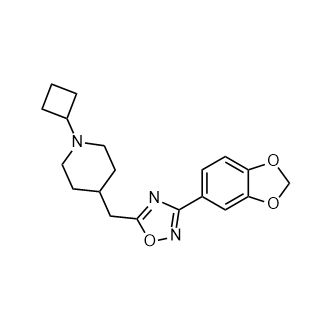 H3R antagonist 1 is a histamine receptor 3 (H3R) inverse agonist. H3R antagonist 1 increases the expression levels of myelin-associated glycoprotein (MAG) and myeline basic protein (MBP) in differentiating oligodendrocytes. H3R antagonist 1 can be used for the study of multiple sclerosis[1]. IC50 & Target:Histamine receptor 3[1] In Vitro: H3R antagonist 1 (example 2) promotes oligodendrocyte precursor cell (OPC) differentiation in a dose-dependent manner, at EC50 = 25 nM. Western blot reveals a significant increase in expression levels of two markers of mature oligodendrocytes, myelin-associated glycoprotein (MAG) and myeline basic protein (MBP) in differentiating oligodendrocytes after treatment with H3R antagonist 1, which suggests that treatment with H3R antagonist 1 drives more oligodendrocyte precursor cells to differentiate. H3R antagonist 1 increases the Forskolin (HY-15371)-stimulated cAMP level in the primary oligodendrocyte precursor cells in a dose-dependent manner[1]. In Vivo: The ability of H3R antagonist 1 (example 2) to enhance in vivo remyelination is determined with the Cuprizone (HY-W115718)/Rapamycin (HY-10219)-induced demyelination model. Mice are treated with Cuprizone diet combined with intraperitoneal injections of Rapamycin for 5 weeks followed by 9 days of compound administration. Cuprizone diet plus intraperitoneal injections of Rapamycin induced severe demyelination in both corpus callosum and cortex and treatment with H3R antagonist 1 (30 mg/kg, 9 days) significantly increases density of myelin specific Black-gold II staining in the lesion of corpus callosum and cortex in forebrain, compared to vehicle control group[1].