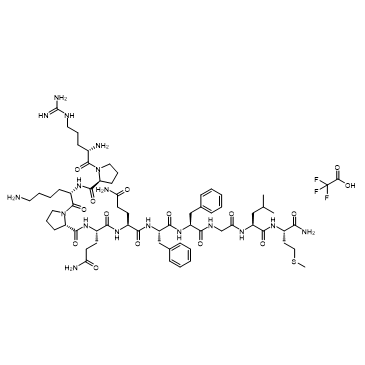 Substance P TFA (Neurokinin P TFA) is a CNS-penetrant neuropeptide, acting as a neurotransmitter and as a neuromodulator in the CNS. The endogenous receptor for substance P is neurokinin 1 receptor (NK1-receptor, NK1R)[1]. IC50 & Target:Neurokinin 1 receptor[1] In Vitro:The neuropeptide substance P (SP) that are mediated by the neurokinin 1 receptor (NK1-R) desensitize and resensitize, which may be associated with NK1-R endocytosis and recycling. SP and the NK1-R are internalized into the same clathrin immunoreactive vesicles, and then sorted into different compartments. SP is intact at the cell surface and in early endosomes, but slowly degraded in perinuclear vesicles. SP induces clathrin-dependent internalization of the NK1-R. The SP/NK1-R complex dissociates in acidified endosomes. SP is degraded, whereas the NK1-R recycles to the cell surface. SP induces internalization of the NK1-R both in transfected epithelial cells[1].