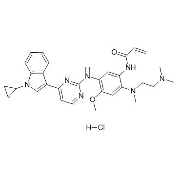 Almonertinib (HS-10296) hydrochloride is an orally available, irreversible, third-generation EGFR tyrosine kinase inhibitor with high selectivity for EGFR-sensitizing and T790M resistance mutations. Almonertinib hydrochloride shows great inhibitory activity against T790M, T790M/L858R and T790M/Del19 (IC50: 0.37, 0.29 and 0.21 nM, respectively), and is less effective against wild type (3.39 nM). Almonertinib hydrochloride is used for the research of the non-small cell lung cancer[1][2]. IC50 & Target: EGFR[1]. In Vitro: Almonertinib (HS-10296) is an orally available inhibitor of the epidermal growth factor receptor (EGFR) mutant form T790M, with potential antineoplastic activity, which canbe used to treat NSCLC[2]. Additionaly, Almonertinib (HS-10296) could also inhibit other EGFR sensitive mutations, including G719X, del19, L858R and L861Q[3].