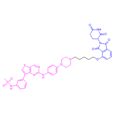 DB0614 is a PROTAC based on Cereblon ligand, which is a selective and potent targeted protein degrader of NEK9 inhibitor. DB0614 can degrade ABL1, ABL2, BLK, CDK11B, CDK4, CSK, EPHA3, FER, GAK, LIMK1, MAP3K20, MAP4K1, MAP4K2, MAP4K3, MAP4K5, MAPK14, MAPK7, MAPK8, MAPK9, MAPKAPK2, MAPKAPK3, NLK, PDIK1L, PTK2B, RIPK1, RPS6KA1, RPS6KA3, SIK2, SIK3, STK35, TNK2 and ULK1. DB0614 can be used for research of disease or disorder mediated by aberrant kinase activity[1][2].(Blue: Thalidomide-4-OH (HY-103596), Black: linker, Pink: FLT3-IN-17 (HY-148070))