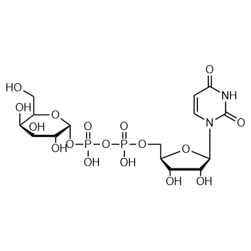 UDP-Galactose is a monosaccharide and a key glycosyl donor molecule in cells that participates in nucleotide sugar metabolism. UDP-Galactose is the natural agonist of the P2Y14 receptor coupled to Gi proteins in the immune system (IC50 = 0.67 μM, hP2Y14). UDP-Galactose can be used to study cell signal transduction and substance metabolism[1][2].