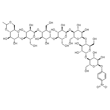 Ethylidene-4-nitrophenyl-a-D-Maltoheptaoside (pNP-G7) is the substrate of α-amylase. Ethylidene-4-nitrophenyl-a-D-Maltoheptaoside is degraded by amylase in the presence of auxiliary enzymes (such as α-glucosidase) to release the chromophore, allowing the measurement of amylase activity. Ethylidene-4-nitrophenyl-a-D-Maltoheptaoside can be used for the diagnosis of pancreatitis[1][2].
