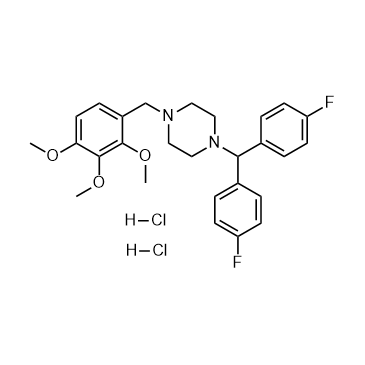 Lomerizine dihydrochloride is an antagonist of L- and T-type voltagegated calcium channels. IC50 & Target: L- and T-type calcium channel[1] In Vitro: Lomerizine is an antagonist of L- and T-type voltagegated calcium channels and transient receptor potential channel 5 transient receptor potential channels. Lomerizine is a dual L/T-type channel blocker used for prophylaxis of migraine. To demonstrate the effectiveness of Lomerizine in limiting intracellular [Ca2+], its ability to inhibit glutamate-induced death of motor neurons and the associated rise in cytosolic [Ca2+] is evaluated. Lomerizine inhibits the low- and high-voltage activated Ca2+ currents in dissociated rat brain neurons at a threshold concentration of 0.01 μM and IC50 of 1.9 μM and H2O2-induced Ca2+ influx in hippocampal neurons is inhibited by 1 μM Lomerizine. Pre-treatment with 1 μM Lomerizine significantly reduces acute death of motor neurons in spinal cord-DRG cultures exposed to 50 μM glutamate, a concentration that kills approximately 40% of motor neurons in the culture by 6 h, and inhibits the rise in cytosolic [Ca2+] that occurs with glutamate treatment. 0.5 μM Lomerizine is sufficient to significantly prevent the mitochondrial fragmentation of mitochondria induced by SOD1G93A[1]. Lomerizine increases the cytotoxicity of Adriamycin (ADM) and the apoptosis induced by ADM or Vincristine (VCR) in K562/ADM cells. At the concentration of 3, 10 and 30μM, Lomerizine reduces the IC50 value of ADM from 79.03 μM to 28.14, 8.16 and 3.16 μM, respectively. Lomerizine increases the intracellular accumulation of ADM and inhibits the efflux of Rh123 in K562/ ADM cells. No change in P-gp expression is observed after the treatment of Lomerizine for 72 h. Lomerizine has strong reversal effect on MDR in K562/ADM cells by inhibiting P-gp function[2]. In Vivo: To determine whether Ca2+ signaling molecules mediate NMDA-induced neurotoxicity in p50-deficient mice, the neuroprotective effects of chemical reagents are examined, which act on the Ca2+-signaling pathway including CaN activation, on NMDA-induced RGC death. The p50-deficient mice at 2 months of age, showing normal RGC survival, undergo intraperitoneal pretreatments with a NMDA antagonist, MK801 or Memantine; calcium blocker, Lomerizine; and CaN inhibitor, Tacrolimus, daily for 1 week before the injection of 5 nM NMDA. The chronic administration of Lomerizine or Tacrolimus to KO mice for 6 months results in an increase in surviving RGC numbers (p<0.0001)[3]. Lomerizine (KB-2796; 0.3 and 1 mg/kg, i.v.) dose-dependently increases cerebral blood flow significantly at 30 min and 15 min, respectively, after its administration. Lomerizine (1 mg/kg, i.v.) significantly attenuates the expression of c-Fos-like immunoreactivity in the ipsilateral frontoparietal cortex[4].