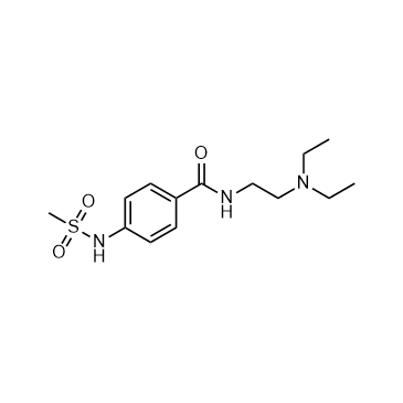 Sematilide (CK-1752) is a selective IKr channel blocker. Sematilide causes a concentration-dependent inhibition of the delayed rectifier K+ current (IC50=25 μM). Sematilide is a class III antiarrhythmic agent[1]. IC50 & Target: IC50: 25 μM (K+ current)[1] In Vitro: Application of 10, 30, 100 and 300 μM Sematilide causes a concentration-dependent inhibition of the delayed rectifier K+ current (IC50=25 μM)[1]. In Vivo: Sematilide (0.3-1.0 mg/kg, intravenously i.v.) is effective in a canine model of arrhythmia[2].