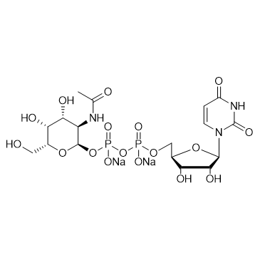 UDP-GalNAc (UDP-N-acetyl-D-galactosamine) disodium is a sugar nucleotide and a substrate for EpsC115. EpsC115 is a mutant with N-terminal residues 1-115 deleted from the exopolymeric substance (EPS). UDP-GalNAc disodium is a donor substrate for many N-acetylgalactosaminyltransferases, which transfer GalNAc from nucleotide sugars to sugar or peptide acceptors. UDP-GalNAc disodium provides a sugar group donor for glycosylation reactions. UDP-GalNAc disodium can be used in cancer research, such as colorectal and breast cancer[1][2][3][4]. In Vitro:UDP-GalNAc (25 μM) disodium is used in in vitro glycosylation assays with purified ppGalNAc-T2 and T3[3].
