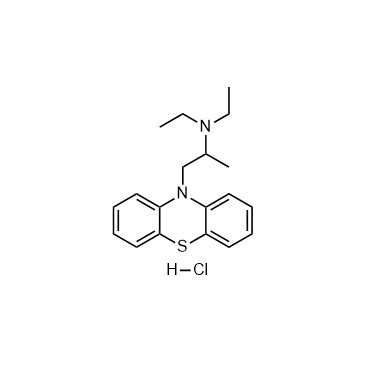 Ethopropazine (hydrochloride) (Standard) is the analytical standard of Ethopropazine (hydrochloride) (HY-107922). This product is intended for research and analytical applications. Ethopropazine (Isothazine) hydrochloride is a potent and selective BChE inhibitor, a poor AChE inhibitor and a non-selective mAChR and NMDA antagonist. Ethopropazine hydrochloride has anticholinergic, antihistamine, antiadrenergic actions and properties. Ethopropazine hydrochloride alleviates thermal hyperalgesia in a dose dependent manner. Ethopropazine hydrochloride can be used for the research of Parkinson’s disease[1][2][3][4][5]. IC50 & Target:BChE, AChE[2]