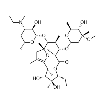 EM-523 is a motilin agonist and an erythromycin derivative. EM-523 has pED50 values of 8.19 and 6.08 for promoting contractions in rabbit small intestinal tissue and human duodenal tissue, respectively. EM-523 can be used in the research of gastrointestinal diseases[1].