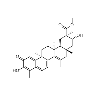 Netzahualcoyonol is a quinone methyl triterpene isolated from the roots of Salacia multiflora (Lam.) DC. Netzahualcoyonol exhibits antibacterial and anti-biofilm activities. Netzahualcoyonol inhibits Gram-positive bacteria (MIC=3.26–52 μM). Additionally, Netzahualcoyonol demonstrates cytotoxicity against Hep G2 cells (IC50 = 1.95 μM) but exhibits low toxicity towards Vero cells[1][2].