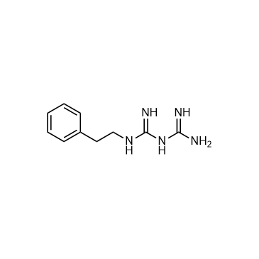 Phenformin (Phenethylbiguanide) is an orally active biguanide hypoglycemic agent. Phenformin inhibits mitochondrial respiratory chain complex I, leading to an increased AMP/ATP ratio, activation of AMPK, and subsequent inhibition of the mTOR pathway, thereby suppressing cell proliferation, inducing apoptosis and autophagy. Phenformin inhibits cancer stem cells (CSCs) and possesses potent antitumor potential.