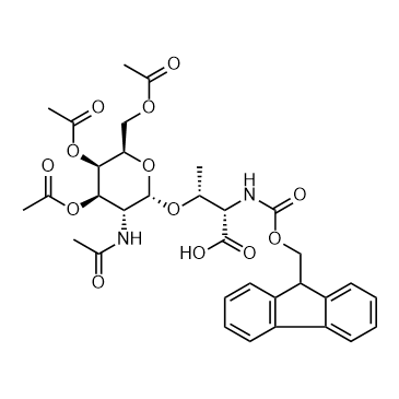 Fmoc-Thr[GalNAc(Ac)3-α-D]-OH i a building block in the development of cancer vaccine. In Vitro: The O-glycosidic linkage and the O-acetyl protection in this building block is stable to both piperidine and TFA, making it completely compatible with standard protocols in Fmoc solid phase peptide synthesis. The Tn antigen is a tumor-associated carbohydrate antigen that is not normally expressed in peripheral tissues or blood cells. Expression of this antigen, which is found in a majority of human carcinomas of all types, arises from a blockage in the normal O-glycosylation pathway in which glycans are extended from the common precursor GalNAcα1-O-Ser/Thr (Tn +antigen). This precursor is generated in the Golgi apparatus on newly synthesized glycoproteins by a family of polypeptide α- N-acetylgalactosaminyltransferases (ppGalNAcTs) and then extended to the common core 1 O-glycan Galβ1-3GalNAcα1-OSer/Thr (T antigen) by a single enzyme termed the T-synthase (core 1 β3-galactosyltransferase or C1GalT). Formation of the active form of the T-synthase requires a unique molecular chaperone termed Cosmc, encoded by Cosmc on the X-chromosome[1].