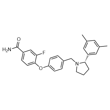 Aticaprant (CERC-501) is a potent and centrally-penetrant kappa opioid receptor antagonist with a Ki of 0.807 nM. IC50 & Target: Ki: 0.807 nM (kappa opioid)[1] In Vitro: Aticaprant (CERC-501) binds with high affinity to the human kappa opioid receptor with a 30-fold higher affinity over the human mu opioid receptor and 190-fold higher affinity over the human delta opioid receptor. Aticaprant (CERC-501) shows no appreciable affinity for several non-opioid cell surface G-protein-coupled receptor targets, including monoaminergic, muscarinic, cholinergic, and adrenergic receptors or ion channel/transporter binding targets or the central benzodiazepine binding site[1]. In Vivo: Aticaprant (CERC-501) has a rapid absorption (tmax=1-2 h) and good oral bioavailability (F=25%). Oral Aticaprant (CERC-501) administration selectively and potently occupies central kappa opioid receptors (ED50=0.33 mg/kg), without evidence of mu or delta receptor occupancy. LY2456302 potently blocks kappa-agonist-mediated analgesia and disruption of prepulse inhibition, without affecting mu-agonist-mediated effects at doses >30-fold higher. Aticaprant (CERC-501) produces antidepressant-like effects in the mouse forced swim test and enhances the effects of imipramine and citalopram. Aticaprant (CERC-501) reduces ethanol self-administration in alcohol-preferring rats[1]. Aticaprant (CERC-501) alleviates the nicotine withdrawal syndrome, as evidenced by decreased expression of nicotine withdrawal induced anxiety-related behavior, somatic signs, and CPA, and increased hotplate latency in nicotine withdrawn mice following pre-treatment[2].