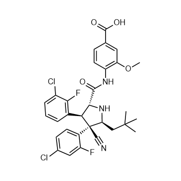 Idasanutlin (RG7388) is a potent and selective MDM2 antagonist, inhibiting p53-MDM2 binding, with an IC50 of 6 nM. IC50 & Target:IC50: 6 nM (p53-MDM2)[1] In Vitro:Idasanutlin (RG7388) inhibits cell proliferation with IC50 of 30 nM, and induces dose-dependent p53 stabilization, cell cycle arrest, as well as cell apoptosis in cancer cells expressing wild-type p53[1]. Idasanutlin (RG7388) (300 nM or 1.8 μM) induces apoptosis in SJSA osteosarcoma cells[2]. In Vivo:Idasanutlin (RG7388, 25 mg/kg p.o.) results in tumor growth inhibition and regression, in the mouse SJSA human osteosarcoma xenograft model[1]. Idasanutlin (RG7388) induces induction of apoptosis and antiproliferation, in the SJSA xenograft model[2].