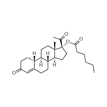 Gestonorone Capronate is a progestin for the treatment of benign prostatic hypertrophy and endometrial cancer. In Vitro: The administration of gestonorone capronate impedes testosterone reduction. The oxydation pathway remains uninfluenced. This inhibition of the formation of 5α-reduction products is present at the lowest dose of gestonorone capronate and is augmented progressively with increasing gestonorone capronate concentration[1].