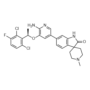SMU-B is the orally active inhibitor for ALK (IC50<0.5 nM), c-ros oncogene 1 (ROS1), c-MET (IC50=1.87 nM) and AXL (IC50=28.9 nM). SMU-B inhibits the proliferation of MKN45, H1993 and H441 with IC50s of 0.02 μM, 1.58 μM and 2.82 μM, respectively. SMU-B exhibits antitumor efficacy in mouse models[1][2]. IC50 & Target:IC50: <5 nM (ALK); 1.87 nM (c-MET); 28.9 nM (AXL)