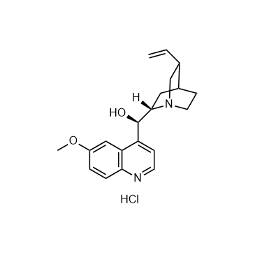 Quinine (hydrochloride) is an alkaloid derived from the bark of the cinchona tree, acts as an anti-malaria agent. Quinine (hydrochloride) is a potassium channel inhibitor that inhibits WT mouse Slo3 (KCa5.1) channel currents evoked by voltage pulses to +100 mV with an IC50 of 169 μM[1][2].
