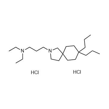 Atiprimod (Azaspirane) hydrochloride is a STAT3 inhibitor with antitumor, anti-inflammatory, and anti-angiogenic activities. Atiprimod blocks the signaling pathways of IL-6 and VEGF by inhibiting the phosphorylation of signal transducer and activator of STAT3. Atiprimod blocks the JAK-STAT signaling pathway by inhibiting the phosphorylation of JAK2 and JAK3. Atiprimod also inhibits cell proliferation, induces cell cycle arrest, and induces autophagy and apoptosis. Atiprimod triggers persistent ER stress-mediated apoptosis in breast cancer cells by activating the PERK/eIF2α/ATF4/CHOP axis and inhibiting the nuclear translocation of STAT3/NF-κB. Atiprimod shows great anti-tumor activities in tumor xenograft mouse models. Atiprimod can be used for the study of pituitary adenoma, breast cancer, multiple myeloma and acute myeloid leukemia (AML)[1][2][3][4][5][6].