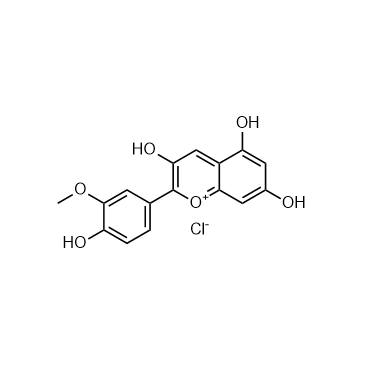 Peonidin chloride is an O-methylated anthocyanidin that functions as a primary plant pigment, endowing purplish-red hues to flowers such as the peony, from which it takes its name, as well as berries and vegetables. Peonidin chloride exhibits chemopreventive, as well as anti-inflammatory activities on cancer cells in vitro, blocking COX-2 expression and transformation in JB6 P+ mouse epidermal cells.