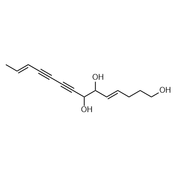 Lobetyol is a natural compound that can be isolated from Lobelia chinensis. Lobetyol induces apoptosis and cell cycle arrest in MKN45 cells. Lobetyol shows anti-virus, anti-inflammation and anti-tumor activity[1][2]. Lobetyol is a click chemistry reagent, itcontains an Alkyne group and can undergo copper-catalyzed azide-alkyne cycloaddition (CuAAc) with molecules containing Azide groups.