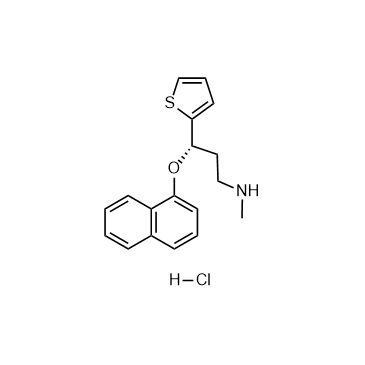 Duloxetine hydrochloride ((S)-Duloxetine hydrochloride) is a serotonin-norepinephrine reuptake inhibitor (SNRI) with a Ki of 4.6 nM, used for treatment of major depressive disorder and generalized anxiety disorder (GAD)[1][2]. In Vitro:Duloxetine hydrochloride is a serotonin-norepinephrine reuptake inhibitor(SNRI) that can be used for the study of major depressive disorder and generalized anxiety disorder (GAD)[1][2].