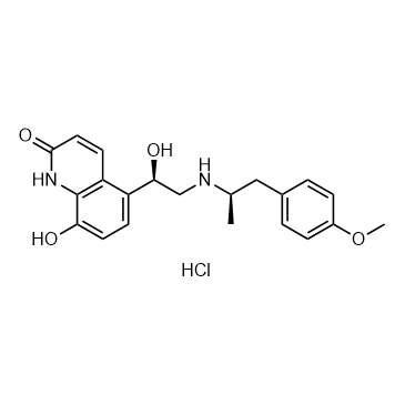 Carmoterol hydrochloride is a highly potent, selective and long-acting β2-adrenoceptor agonist with the pEC50 of 10.19. Carmoterol has 53 times higher affinity for the β2-adrenoceptors than for the β1-adrenoceptors. Carmoterol hydrochloride can be used for the research of asthma and chronic obstructive pulmonary disease (COPD)[1][2].