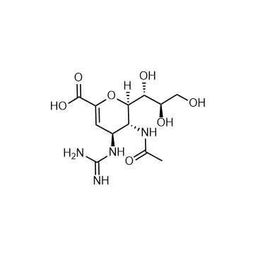 Zanamivir is an influenza viral neuraminidase inhibitor with IC50 values of 0.95 nM and 2.7 nM for influenza A and B, respectively. IC50 & Target: IC50: 0.95 nM (Influenza A); 2.7 nM (Influenza B)[1] In Vitro: Zanamivir interacts with a group of amino acids in the active site of neuraminidase, which are conserved in all influenza A and B strains. Zanamivir blocks the action of neuraminidase, which prevents the cleavage of sialic acid on the cell receptors, thus preventing release and spread of the newly formed virions[2]. In Vivo: Zanamivir has a poor bioavailability in oral administration, with only 4–17% of the agent. Oral delivery of zanamivir has been a problem due to its strong hydrophilic nature that limits its transport across the intestinal epithelium. Permeation enhancers such as sodium cholate, hydroxypropyl β-cyclodextrin could be used with zanamivir to enhance the intestinal permeability[3].