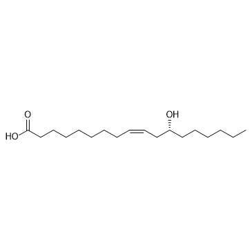 In Vitro:Ricinoleic acid (10-100 μM, 24 h) inhibits the release of β-HEX in RBL-2H3 cells induced by DNP-BSA in a dose-dependent manner in RBL-2H3 cells[2].