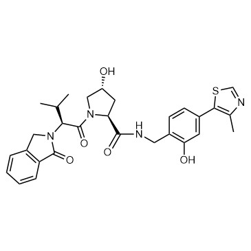 VL285 Phenol is a VL285 analogue with Phenol group. VL285, a small molecule VHL ligand, can be served as a degrader for HaloPROTAC3 synthesis.VL285 degrades HaloTag7 fusion proteins (IC50=0.34 μM)[1]. In Vitro:VL285 (100 μM; 24 h) attenuates the ability of HaloPROTAC3 to induce the degradation of GFP-HaloTag7[1].