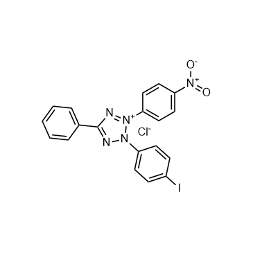 INT (Iodonitrotetrazolium chloride) is a biochemical reagent mainly used in the iodonitrotetrazolium chloride (INT) colorimetric method to assess the metabolic activity of cells and the activity of enzymes[1]. In Vitro:INT can be used as a substrate for detection of dehydrogenase activity. Dehydrogenases are a class of enzymes that catalyze the oxidation of organic compounds by transferring hydrogen atoms to soluble INT to form red formazan, which can be quantitatively detected by colorimetry. INT acts as an electron acceptor to detect dehydrogenase activity and can be used to monitor microbial respiration, cell viability, and bacterial metabolism[2].