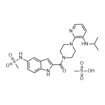 Delavirdine (U 90152) mesylate is a potent, highly specific and orally active non-nucleoside reverse transcriptase inhibitor (NNRTI). Delavirdine mesylate selectively inhibits HIV-1 reverse transcriptase (RT) (IC50=0.26 μM) over DNA polymerase α (IC50=440 μM) and polymerase δ (IC50>550 μM). Delavirdine mesylate is an inhibitor of HIV-1 replication and can can be used for the study of AIDs[1]. IC50 & Target: IC50: 0.26 μM (HIV-1 RT); 440 μM (DNA polymerase α); >550 μM (DNA polymerase δ)[1] In Vitro: Delavirdine has an 50% cytotoxicity at concentrations >100 μM in H9 and PBMC cultures.Delavirdine has low cellular cytotoxicity, causing less than 8% reduction in peripheral blood lymphocyte viability at 100 μM[1].Delavirdine inhibits HIV-1 reverse transcriptase (RT) wild type with an IC50 value of 0.26 μM, and it inhibits Y181C-substituted RT and K103N-substituted RT with IC50 values of 8.32 uM and 7.7 uM, respectively[1]. In Vivo: Delavirdine (U 90152) mesylate (oral gavage; 10 mg/kg, 200 mg/kg, 250 mg/kg; single dose) is absorbed and metabolized rapidly, that it constitutes a minor component in circulation, that its pharmacokinetics are nonlinear, and that its metabolism to desalkyl delavirdine is capacity limited or inhibitable in CD-1 mice (PK study)[1].