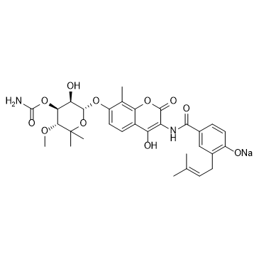 Novobiocin (Albamycin) sodium is a potent and orally active antibiotic. Novobiocin sodium also is a DNA gyrase inhibitor and a heat shock protein 90 (Hsp90) antagonist. Novobiocin sodium has the potential for the research of highly beta-lactam-resistant pneumococcal infections. Novobiocin sodium shows anti-orthopoxvirus activity[1][2][3][4].
