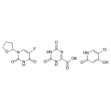 Tegafur-gimeracil-oteracil potassium (TS-1) is an oral anticancer agent composed of Tegafur (HY-17400), Gimeracil (HY-17469), and Oteracil potassium (HY-17511) at a molar ratio of 1:0.4:1. TS-1 can be utilized in research on the peritoneal dissemination of gastric cancer[1].