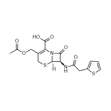 Cephalothin (Standard) is the analytical standard of Cephalothin (HY-B1275A). This product is intended for research and analytical applications. Cephalothin (Cephalotin) is a semi-synthetic cephalosporin antibiotic and beta-lactam antibiotic. Cephalothin inhibits class C β-lactamase AmpC, with an Ki of 0.32 µM. Cephalothin binds to penicillin-binding proteins, interfering with the cross-linking of peptidoglycan in the cell wall and thus hindering the normal synthesis of the bacterial cell wall. Cephalothin shows antibacterial activity against a variety of bacteria. Cephalothin can be used in hematological and nephrotoxicity studies[1][2][3][4][5][6][7]. IC50 & Target:Ki: 0.32 μM (β-lactamase AmpC)[1]
