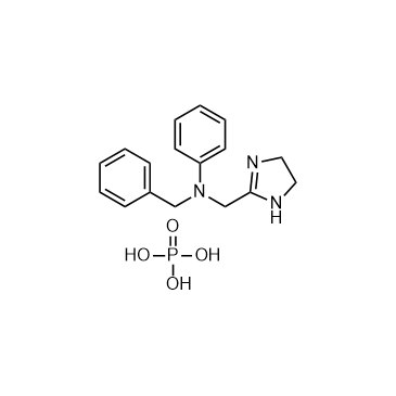 Antazoline phosphate is an H1 receptor antagonist that affects the activity of the central nervous system, has a potent antiarrhythmic effect[1][2][3]. Antazoline phosphate is a histamine H1 receptor antagonist with anticholinergic and antiviral properties. Antazoline phosphate can prevent histamine from acting on target cells through a reversible competition effect on histamine receptor sites of these cells. Antazoline phosphate can exert an antiallegic effect and prevent the occurrence of physiological reactions from the effect of blocking as well as inhibiting H1 receptor. Antazoline phosphate can effectively reduce HBV DNA in the extracellular supernatant in a dose-dependent manner, with EC50 of 2.910 μmol/L in HepAD38 cells. Antazoline phosphate also has a significant inhibitory effect on HBV DNA in the extracellular supernatant of Huh7 cells (EC50 = 2.349 μmol/L). Antazoline phosphate has anti-arrhythmic effect in acute myocardial infarctions. Antazoline phosphate can be studied in research for cardiovascular diseases, and HBV[1][2][3]. In Vitro:Antazoline phosphate shows good inhibitory effect on HBV DNA in the supernatant of HepAD38 and Huh7 cells with the value of EC50 is 2.910 μmol/L and 2.349 μmol/L, respectively[2]. In Vivo:Antazoline phosphate (IP; 0.01 ml/g; 30min) as H1 receptor antagonists diminishes the anticonvulsant activity of carbamazepine and diphenylhydantoin[3].