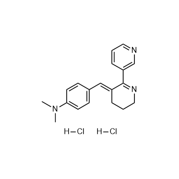 DMAB-anabaseine dihydrochloride is a selective nicotinic α7 receptor partial agonist and an α4β2 nAChR antagonist. DMAB-anabaseine dihydrochloride shows cognition-enhancing effects[1][2]. In Vivo:DMAB-anabaseine dihydrochloride (2 mg/kg; i.p.; daily; for 30 days) shows cognition-enhancing effects and improves long-term memory in rats[2].