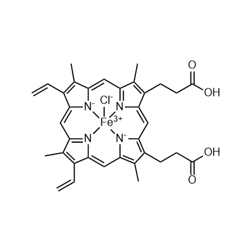 Hemin is an iron-containing porphyrin. Hemin is an Heme oxygenase (HO)-1 inducer. IC50 & Target:Heme oxygenase[1] In Vitro: Hemin and PGJ2, used as positive controls, strongly increase both expression and activity of HMOX after 4 and 12 h, respectively. Indeed, a significant effect is found of 30 μM Hemin on cell proliferation in all used cell lines after 48 h, which is dose-dependent. Hemin treatment decreases cell proliferation to 62±5 %, 51±3 %, and 38±8 % in PA-TU-8902, BxPC-3 and MiaPaCa-2 cancer cells, respectively, with p<0.0001 for all comparisons. Furthermore, enhancement of anti-proliferative effects of statins is observed by Hemin, documented as decreased cell proliferation after 48 h of co-treatment[1]. In Vivo: Following the i.p. administration of Hemin (100 μmol/kg), the HO-1 level in the renal cortex begins to increase gradually. The HO-1 level reaches its peak 24 h after Hemin preconditioning. HO-1 is expressed mainly in the renal tubules. The HO-2 level in the kidney does not change following Hemin preconditioning[2].