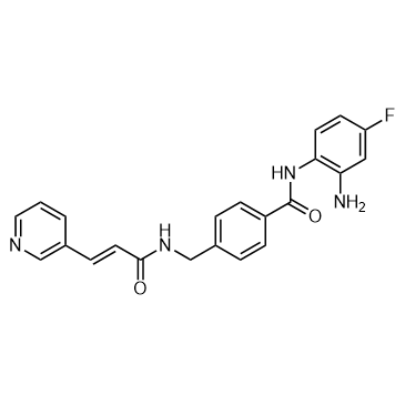 Tucidinostat (Chidamide) is a potent and orally bioavailable HDAC enzymes class I (HDAC1/2/3) and class IIb (HDAC10) inhibitor, with IC50s of 95, 160, 67 and 78 nM, less active on HDAC8 and HDAC11 (IC50s, 733 nM, 432 nM, respectively), and shows no effect on HDAC4/5/6/7/9[1]. IC50 & Target: IC50: 95 nM (HDAC1), 160 nM (HDAC2), 67 nM (HDAC3), 78 nM (HDAC10), 733 nM (HDAC8), 432 nM (HDAC11)[1] In Vitro: Tucidinostat (Chidamide/CS055/HBI-8000) is a potent and orally bioavailable HDAC enzymes class I (HDAC1, 2, 3) and class IIb (HDAC10) inhibitor, with IC50s of 95, 160, 67 and 78 nM, less active on HDAC8 and HDAC11 (IC50s, 733 nM, 432 nM, respectively), and shows no effect on HDAC4/5/6/7/9 (IC50s, >30 μM). Tucidinostat shows potent antitumor activity, and inhibits several human derived tumor cell lines, such as HL-60, U2OS, LNCaP with GI50s of 0.4 ± 0.1, 2.0 ± 0.6, and 4.0 ± 1.2 μM, respectively. In addition, Tucidinostat shows less toxic to normal cells from human fetal kidney (CCC-HEK) and liver (CCCHEL)[1]. In Vivo: Tucidinostat (12.5-50 mg/kg, p.o.) dose-dependently reduces tumor size and tumor weight in mice bearing HCT-8 colorectal carcinoma, A549 lung carcinoma, BEL-7402 liver carcinoma, and MCF-7 breast carcinoma, and with no obvious body loss[1].