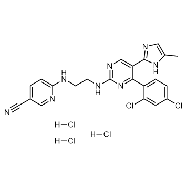 Laduviglusib (CHIR-99021) trihydrochloride is a potent and selective GSK-3α/β inhibitor with IC50s of 10 nM and 6.7 nM. Laduviglusib trihydrochloride shows >500-fold selectivity for GSK-3 over CDC2, ERK2 and other protein kinases. Laduviglusib trihydrochloride is also a potent Wnt/β-catenin signaling pathway activator. Laduviglusib trihydrochloride enhances mouse and human embryonic stem cells self-renewal. Laduviglusib trihydrochloride induces autophagy[1][2][3]. IC50 & Target: IC50: 10 nM/6.7 nM (GSK-3α/β)[1] In Vitro: Laduviglusib trihydrochloride inhibits human GSK-3β with Ki values of 9.8 nM[1]. Laduviglusib trihydrochloride is a small organic molecule that inhibits GSK3α and GSK3β by competing for their ATP-binding sites.In vitro kinase assays reveal that Laduviglusib trihydrochloride specifically inhibits GSK3β (IC50=~5 nM) and GSK3α (IC50=~10 nM), with little effect on other kinases[4]. In the presence of Laduviglusib trihydrochloride the viability of the ES-D3 cells is reduced by 24.7% at 2.5 μM, 56.3% at 5 μM, 61.9% at 7.5 μM and 69.2% at 10 μM Laduviglusib trihydrochloride with an IC50 of 4.9 μM[2]. In Vivo: In ZDF rats, a single oral dose of Laduviglusib (16 mg/kg or 48 mg/kg) trihydrochloride rapidly lowers plasma glucose, with a maximal reduction of nearly 150 mg/dl 3-4 h after administration[1]. Laduviglusib (2 mg/kg) trihydrochloride given once, 4 h before irradiation, significantly improves survival after 14.5 Gy abdominal irradiation (ABI). Laduviglusib trihydrochloride treatment significantly blocks crypt apoptosis and accumulation of p-H2AX+ cells, and improves crypt regeneration and villus height. Laduviglusib trihydrochloride treatment increases Lgr5+ cell survival by blocking apoptosis, and effectively prevents the reduction of Olfm4, Lgr5 and CD44 as early as 4 h[5].