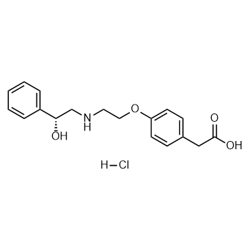 Talibegron hydrochloride (ZD2079 hydrochloride) is a potent β3-adrenoceptor agonist with a pD2 of 3.72 on phenylephrine-preconstricted rat mesenteric artery. Talibegron hydrochloride has potent vasorelaxant effect[1]. In Vitro: Talibegron hydrochloride (ZD2079 hydrochloride; 0.01-1000 μM) produces a concentration-dependent relaxation of phenylephrine-preconstricted isolated mesenteric arteries and causes full relaxation with 1 mM[1].