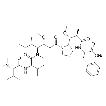 MMAF sodium GMP is a GMP grade MMAF (sodium) (HY-15579B). MMAF sodium (Monomethylauristatin F sodium) is a potent tubulin polymerization inhibitor and is used as a antitumor agent. MMAF sodium (Monomethylauristatin F sodium) is widely used as a cytotoxic component of antibody-drug conjugates (ADCs) such as Vorsetuzumab mafodotin and SGN-CD19A[1][2][3].
