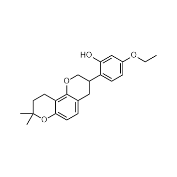 Vutiglabridin (HSG4112), a racemic compound, is a potent anti-obesity agent[1]. Vutiglabridin, an optimized structural analog of Glabridin, markedly supersedes Glabridin in weight reduction efficacy and chemical stability[1]. In Vivo: Vutiglabridin (HSG4112) fully reverses adiposity in HFD-induced obese mice in a dose-dependent manner. Vutiglabridin (orally administered with 10, 30, or 100?mg/kg dose for 6 weeks) dose-dependently reduces body weight and normalizes obesity-related parameters in high-fat diet (HFD)-induced obese mice[2].