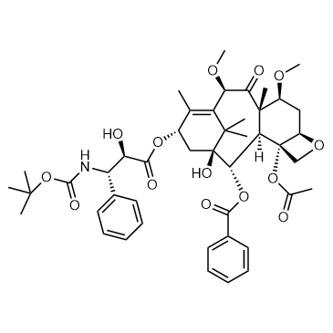 Cabazitaxel is a semi-synthetic derivative of the natural taxoid 10-deacetylbaccatin III with potential antineoplastic activity. In Vitro: The cytotoxicity of cabazitaxel (100 μg/mL) on 4T1 cells without irradiation is 70.8%. Cabazitaxel (100 μg/mL) exhibits a concentration-dependent antiproliferation effect, with the antiproliferative activity of 56.2%[1]. In Vivo: Cabazitaxel (10 mg/kg, i.v.) has certain toxicity to liver and kidney but it can be avoided by integrated into Ans. The body weights of mice treated with AN-ICG-CBX and AN-CBX have a slightly decrease, while body weights of the free CBX group significantly decrease compared to the control group[1].