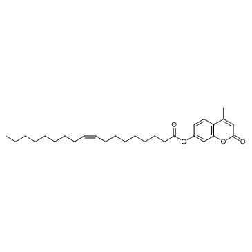 4-Methylumbelliferyl oleate is a fluorogenic substrate for acid and alkaline lipases. 4-Methylumbelliferyl oleate is cleaved by lipases, liberating 4-Methylumbelliferyl (Ex/Em=320/450 nm)[1][2]. In Vitro: The inhibitory activity against pancreatic lipase was measured using 4-Methylumbelliferyl (4-MU) oleate as a substrate. The reaction mixture consisted of 50 µL 0.1 mM 4-MU oleate, 20 µL McIlvane buffer (0.1 M citrate-Na2 HPO4, pH 7.4), and 5 µL of sample solution. Porcine pancreatic lipase (25 µL) was added to the reaction mixture and the final volume was adjusted to 0.1 ml. After the mixture was incubated at 37℃ for 10 min, the amount of 4-MU released by the lipase was measured using a fluorescence multi-detection reader at an excitation wavelength of 320 nm and an emission wavelength of 450 nm[1].