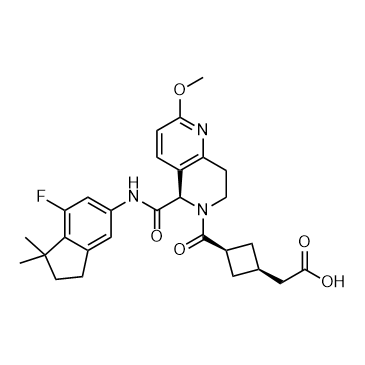 TAK-828F is a potent, selective, and orally available retinoic acid receptor-related orphan receptor γt (RORγt) inverse agonist (binding IC50=1.9 nM, reporter gene IC50=6.1 nM). TAK-828F shows excellent RORγt isoforms selectivity (>5000-fold selectivity against human RORα and RORβ)[1]. IC50 & Target: IC50: 1.9 nM (RORγt, binding IC50), 6.1 nM (RORγt, reporter gene IC50)[1] In Vivo: TAK-828F (0.3, 1, and 3 mg/kg; orally administered; b.i.d.; 28 days; in mice with IL-23-induced cytokine expression model) shows robust and dose-dependent inhibition of IL-17A expression with an ED80 of 0.5 mg/kg[1].