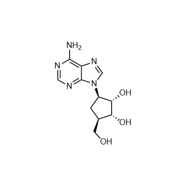 In Vitro: The IC50 value of Aristeromycin against AHCY is 38.5 nM at 50 μM S-adenosylhomocysteine (SAH) (approximately equal to the Km: 48 μM), but 271 nM at 1000 µM SAH (20× Km). With 60 min of preincubation, the mean IC50 value of Aristeromycin at 50 μM SAH is 12.7 nM[1].