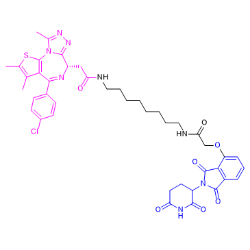 dBET6 is a highly potent, selective and cell-permeable PROTAC connected by ligands for Cereblon and BET, with an IC50 of 14 nM, and has antitumor activity. IC50 & Target:IC50: 14 nM (BET)[1] In Vitro:dBET6 is a highly potent, selective and cell-permeable degrader of BET with an IC50 of 14 nM. dBET6 (100 nM) exhibits antitumor activity against T cell acute lymphoblastic leukemia (T-ALL) lines via degradation of BRD4[1]. In Vivo:dBET6 (7.5 mg/kg, p.o., BID) reduces the leukemic burden in a disseminated mouse model of T-ALL[1].