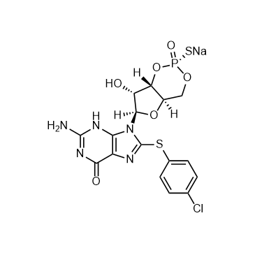 Rp-8-pCPT-cGMPS sodium is the sodium salt form of Rp-8-pCPT-cGMPS. Rp-8-pCPT-cGMPS is an inhibitor for cGMP-dependent protein kinase (cGK). Rp-8-pCPT-cGMPS sodium is an agonist for cyclic nucleotide-gated (CNG) channels in a voltage-dependent manner[1][2]. In Vivo:Rp-8-pCPT-cGMPS sodium (5 nM, intrathecally, once a day for 3 days) inhibits the cGMP-cGKI pathway, suppresses tumor cell implantation (TCI)-induced thermal hyperalgesia and mechanical allodynia in Sprague-Dawley rats model[1].