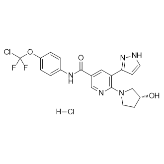 Asciminib hydrochloride lacks activity against more than 60 kinases, including SRC, and is similarly inactive against G-protein-coupled receptors, ion channels, nuclear receptors and transporters[1].