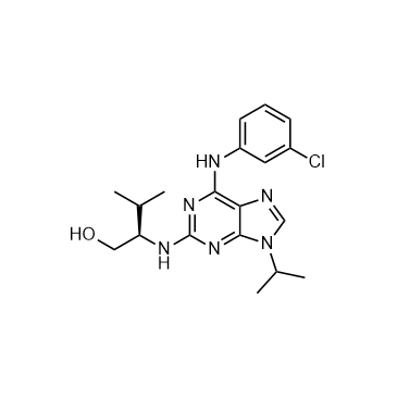 Purvalanol A is a potent CDK inhibitor, which inhibits cdc2-cyclin B, cdk2-cyclin A, cdk2-cyclin E, cdk4-cyclin D1, and cdk5-p35 with IC50s of 4, 70, 35, 850, 75 nM, resepctively. IC50 & Target: IC50: 4 nM (cdc2-cyclin B), 70 nM (cdk2-cyclin A), 35 nM (cdk2-cyclin E), 850 nM (cdk4-cyclin D1), 75 nM (cdk5-p35)[1] In Vitro: Purvalanol A inhibits cdc28 (S. cerevisiae) and erk1 with IC50s of 80 and 9000 nM. Purvalanol A shows inhibitory activities against the NCI panel of 60 human tumor cell lines, with average GI50 of 2 μM; two cell lines show an -20-fold increase in sensitivity to purvalanol A: the KM12 colon cancer cell line with a GI50 of 76 nM and the NCI-H522 non–small cell lung cancer cell line with a GI50 of 347 nM[1]. Purvalanol A is a 2.5-fold more potent inhibitor of CDK2, but also inhibits DYRK1A potently and a number of other protein kinases in the low micromolar range. Purvalanol A inhibits MKK1, MAPK2/ERK2, JNK/SAPK1c with IC50s of 80, 26, 84 μM[2]. Purvalanol A selectively inhibits the phosphorylation of cellular proteins. Purvalanol A prevents the increases of the contents of cyclins D and E during serum-induced G1 phase progression. Purvalanol A does not inhibit transcription under cell-free conditions[3].