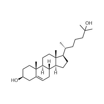 25-Hydroxycholesterol (25-OHC) is a metabolite of cholesterol that is produced and secreted by macrophages in response to Toll-like receptor (TLR) activation. 25-hydroxycholesterol is a potent (EC50≈65 nM) and selective suppressor of IgA production by B cells. In Vitro:The synthesis of 25-hydroxycholesterol is catalyzed by the enzyme cholesterol 25-hydroxylase, which uses cholesterol and molecular oxygen as substrates and NADPH as a cofactor. 25-hydroxycholesterol is a potent bioactive lipid in the innate and adaptive immune systems[1].